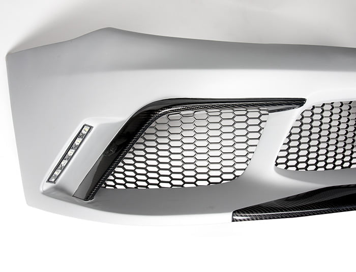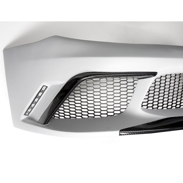 This front bumper is equipped with carbon fibre trim (front lip and eyebrows over the side grilles).